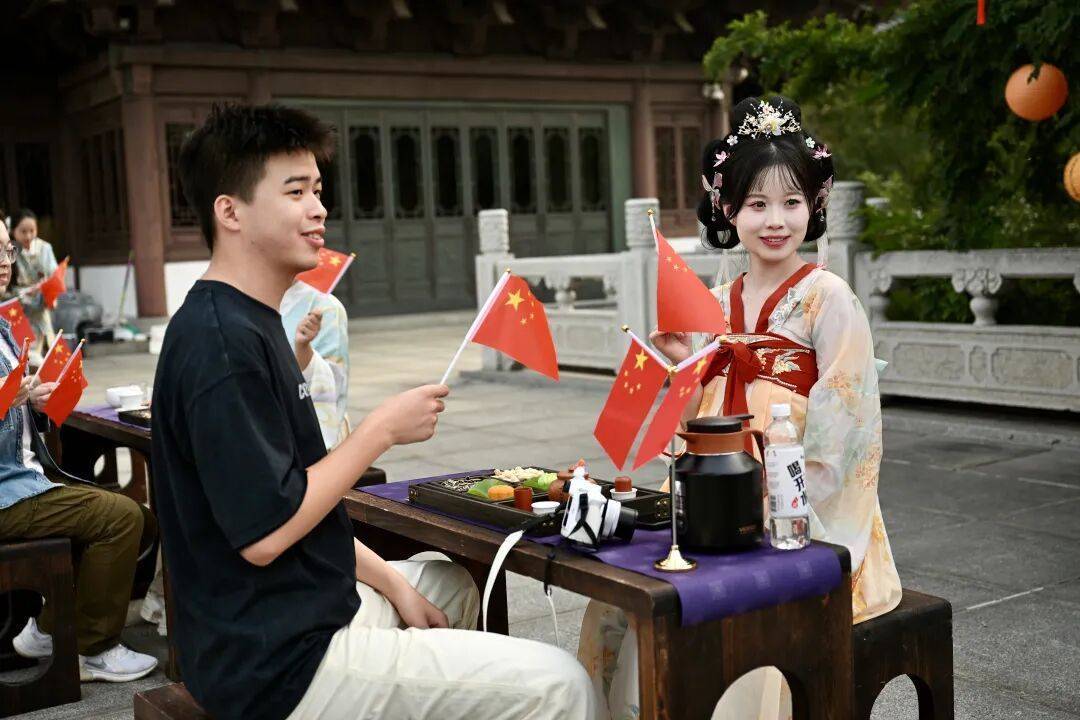 “太震撼了!既看到了传统建筑的美,又感受到了浓浓的爱国情。”大二学生王同学激动地说,她和表姐特意选择国庆当天前来,“亮灯那一刻,真的有种与祖国同频共振的感觉。”